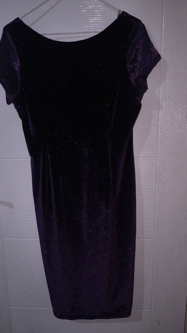 Koyu mor renkte, kısa kollu ve V yakalı, drapeli uzun ve vücuda oturan abiye elbise. Cesur ve göz alıcı tarz için uygun, romantik akşamlar için ideal.