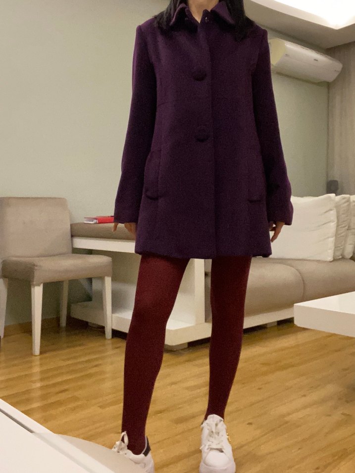 Koyu mor renkte, düğmeli ön kapama, yuvarlak yaka ve yan cepler bulunan kadın kabanı, yumuşak ve sıcak kumaştan yapılmıştır. Ürün Boyner‘den alındı. İthal bir üründür. Ürün yeni kalitesinde temizdir. Omuzdan boy ölçüsü 82 cm.. koltuk altından eni ise 48 cm.. ölçülere bakarak alım yapınız. X Small ve Small bedene uygundur. Kafanıza takılan her şeyi sorabilirsiniz. İade kabul etmiyorum.
