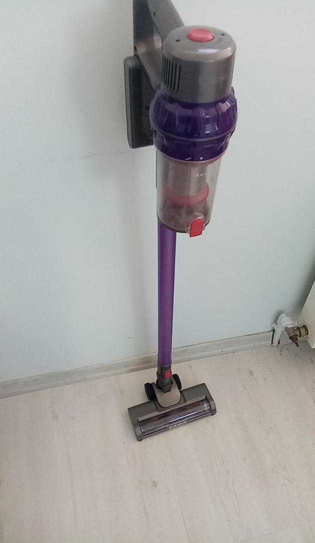 Koyu mor renkli, kablosuz dikey elektrikli süpürge. Şeffaf toz haznesi ve zemin fırçası ile kullanımı ve saklaması kolay.