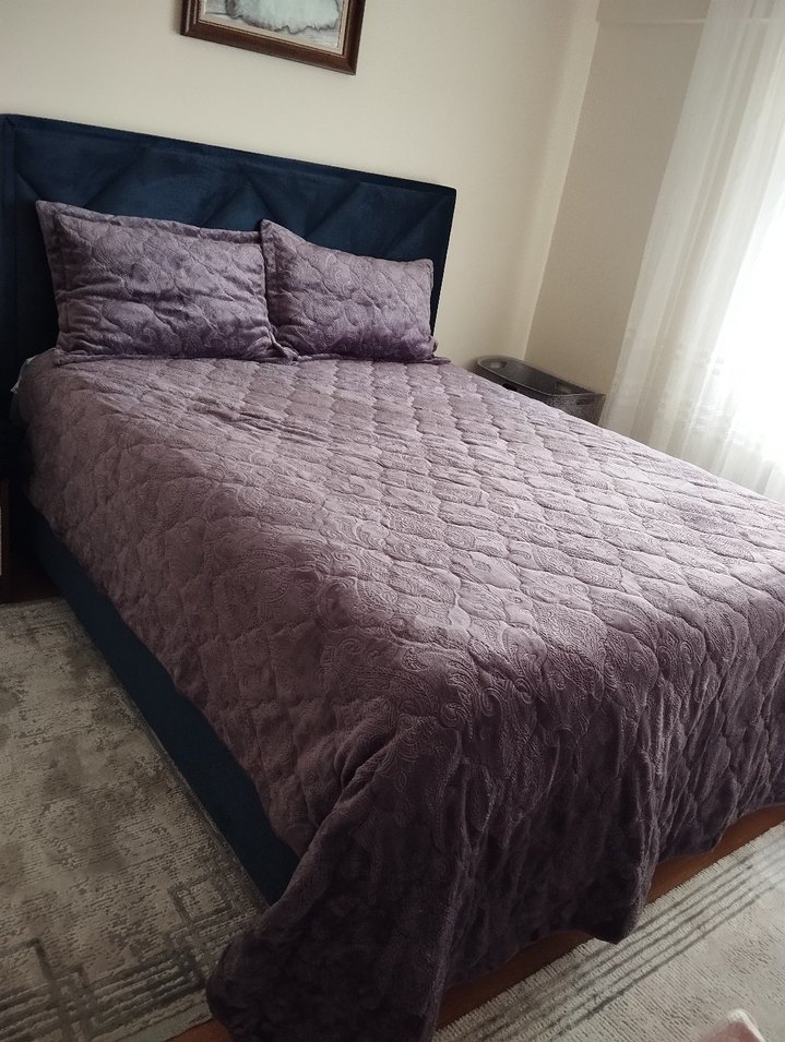Koyu mor renkli, yumuşak dokulu ve hafif kapitone desenli yatak örtüsü, uyumlu yastık kılıflarıyla birlikte çok az kullanıldı yeni yatak aldığım için renk olarak uymuyor ihtiyaç faazlası