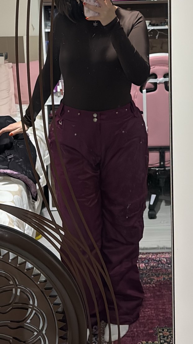 Koyu mor renkte, midi boy ve beli tokalı kayak pantolonu. ürün asla üşütmüyor ben içerisine hiçbir şey giymiyorum, yurt dışı ürün bedeni yazmıyor ben normalde m-l giyiyorum ama bana hafif bol geliyor o yüzden l-xl dir diye düşünüyorum. sağ ve solda belini ayarlamak için çıtçıtları var teklif verebilirsiniz