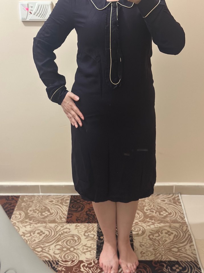 Koyu mor midi uzun kollu elbise, rahat kesimi ve bebe yakalı tasarımıyla ofis için uygundur. İpeksi kumaştan üretilmiş, desensiz ve şık görünür.
