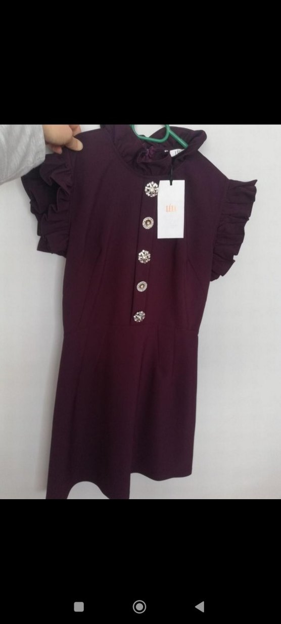 koyu mor renkli, yüksek yakalı ve düğmeli mini elbise, kısa kollu ve belden oturtmalidir. Kollarında fırfır detayları ve baskılı deseni vardır. yeni etiketli