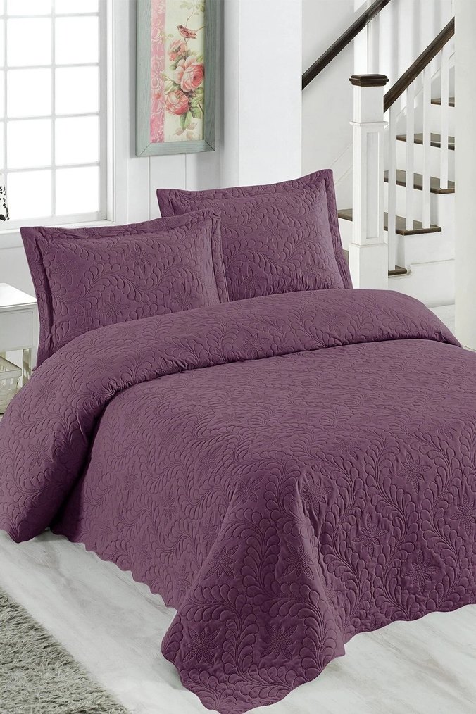 Koyu mor renkte, nakışlı desenli yatak örtüsü, yatak odanıza zarif bir dokunuş katar. ️çift kişiliktir