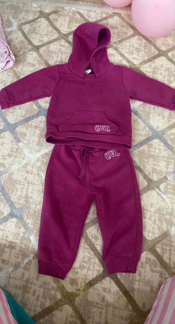 Koyu mor renkte, örgü kumaştan, kapüşonlu uzun kollu üst ve pantolondan oluşan bebek kız takımı.