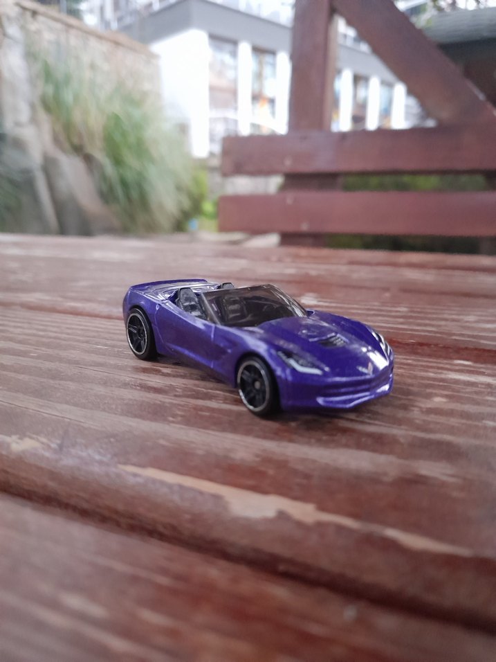 Koyu mor renkte, detaylı tasarıma sahip siyah tekerlekli oyuncak spor araba. Oynanabilir veya sergilenebilir kompakt model.