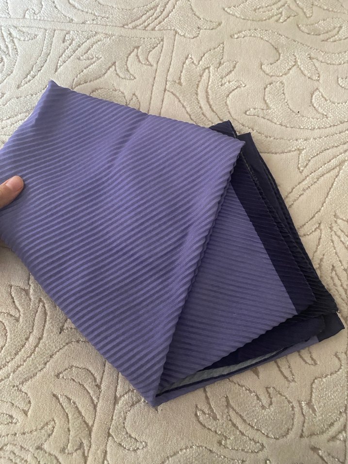 Koyu mor renkte, pilili sentetik kumaştan yapılmış kadın şalı, sade ve rahat bir tarz sunar.