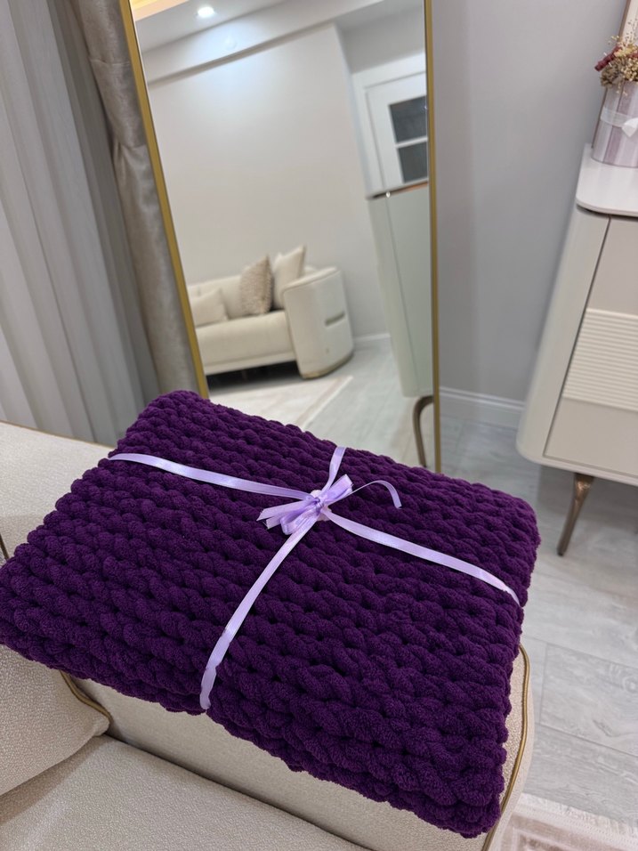 Koyu mor renkte, yumuşak örgü kumaştan yapılmış çocuk battaniyesi. Kalın dokusu ile sıcaklık sağlar ve Puffy ipin yumuşaklığı sayesinde çok tatlı bir bebek battaniyesi. El emeği bir hediye düşünenler için ✨
