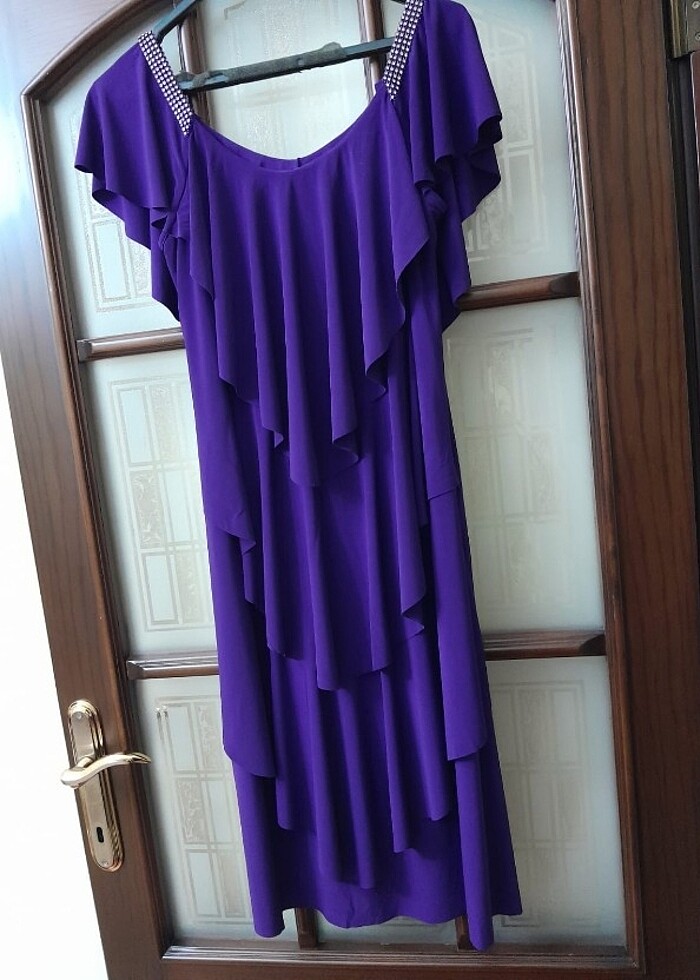 Elbiseyi 3 yıl önce bir butikten almıştım,2 kere giyindim. Elbise çok iyi durumda,koyu mor renk,boyu dizde,önü kat kat arkası düz,omuzlarında taş detayı vardır,likralı bir kumaşa sahiptir.