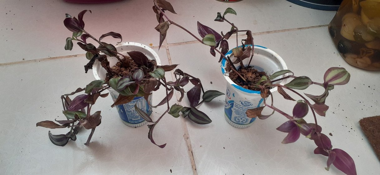 Koyu mor renkli, yeşil çizgili yapraklara sahip saksı bitkisi, geri dönüştürülmüş kaplarda. Ev dekorasyonuna farklı bir dokunuş.