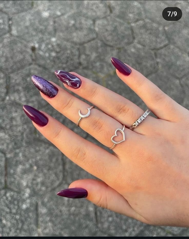 Parlak, simli ve dalgalı desenlerle koyu mor tırnak süslemeleri. Tırnaklara şık bir dokunuş katar.
