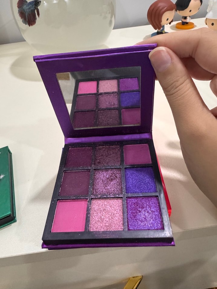 Koyu mor tonlarında, mat ve ışıltılı dokularda göz farı paleti. İçinde ayna bulunan kompakt kutuda saklanır.