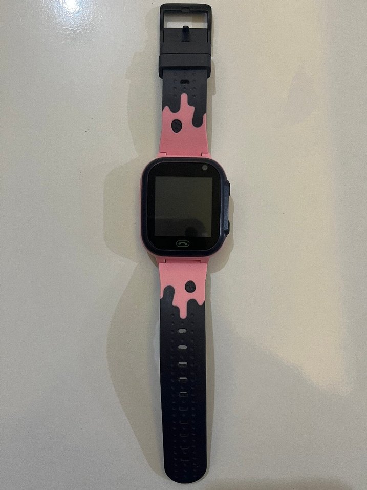 Dikdörtgen ekranlı, koyu pembe ve desenli kayışa sahip ayarlanabilir akıllı saat.⌚cocuk akilli saat simkartli