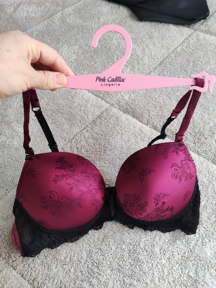 Koyu pembe baskılı ve siyah dantel detaylı, Paris tarzı gotik sütyen. Pink Cadillac Lingerie markasına ait, midi uzunlukta.