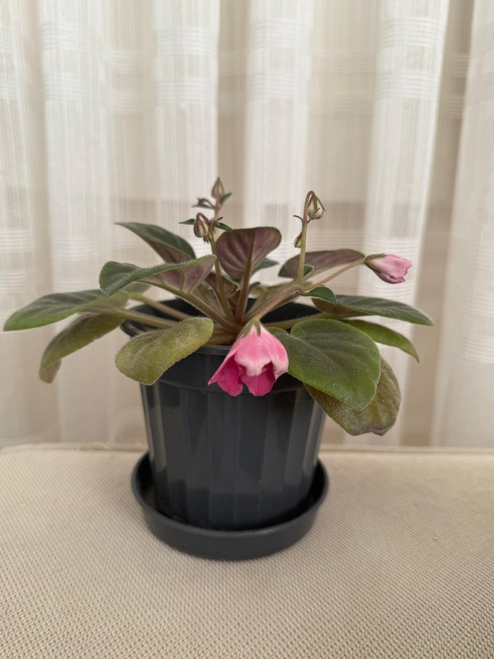 Koyu pembe çiçeği olan, siyah plastik saksı ve tabağı ile iç mekan bitkisi.