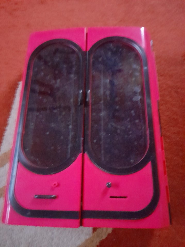 İki kapaklı, şeffaf panelli ve kilitli koyu pembe çocuk dolabı.