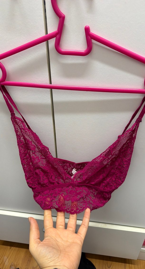 Koyu pembe renkte, ince ayarlanabilir askılı, dantelli ve bohem tarzda normal uzunlukta bir bralet. Desensiz ve yumuşak kumaştan yapılmıştır.
