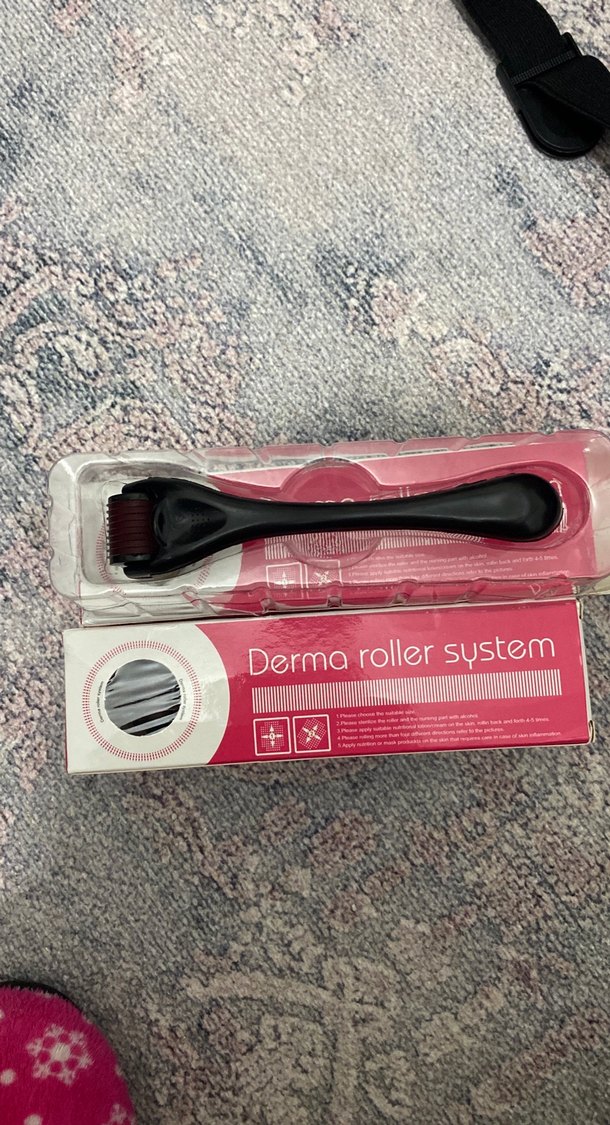 Koyu pembe renkte, cilt bakımı için ince mikro iğneler içeren derma roller sistemi. Cilt görünümünü iyileştirir.