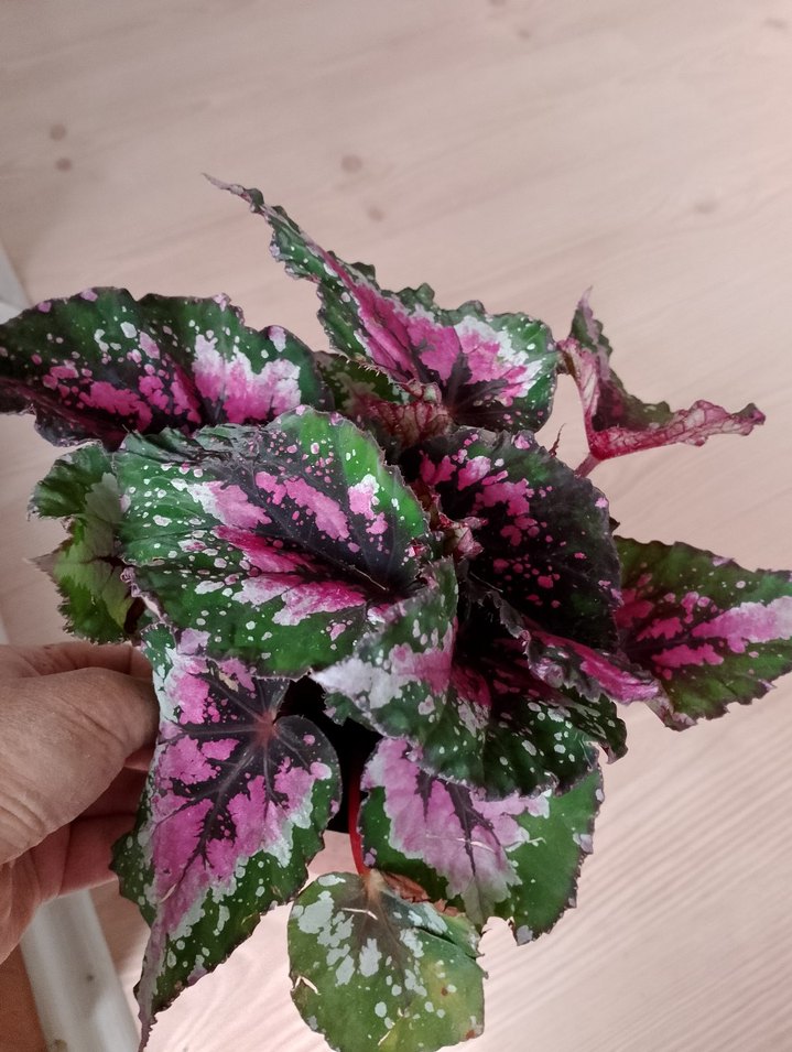 Koyu pembe ve yeşil desenli yapraklara sahip Begonya bitkisi, ev dekorasyonuna canlılık katar.