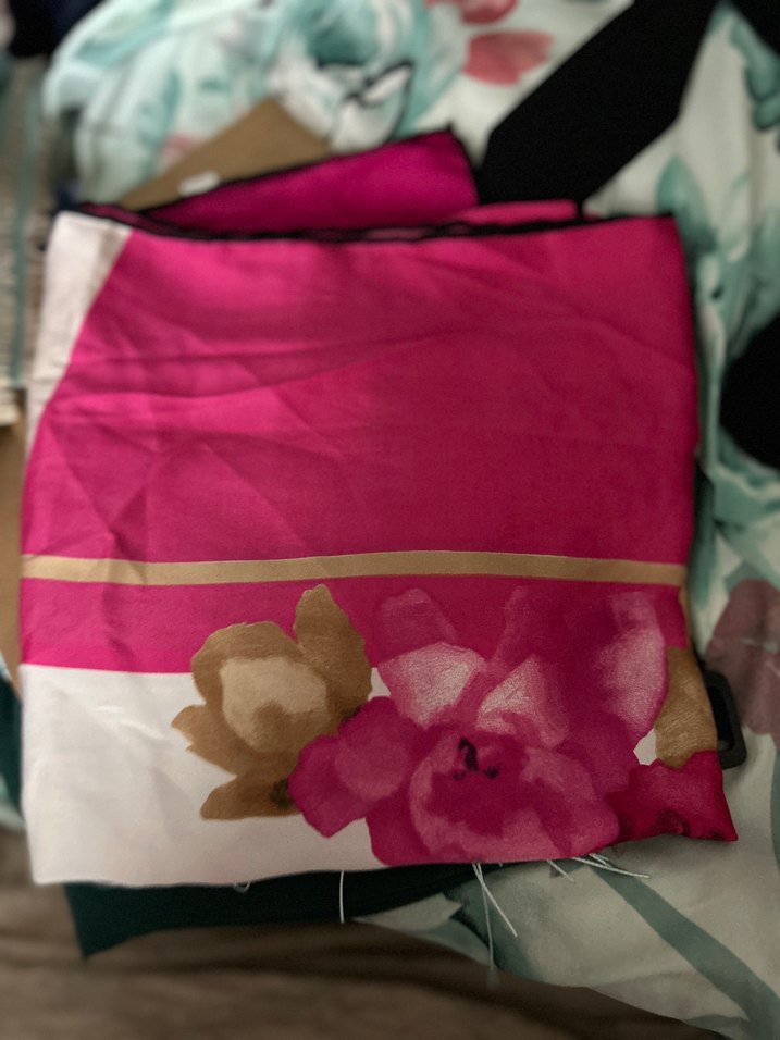 Kadın şal, koyu pembe renk ve çiçek desenleriyle, yumuşak sentetik kumaştan, bohem tarzda drapeli şekilde tasarlanmıştır. Eşarplar tanesi 50