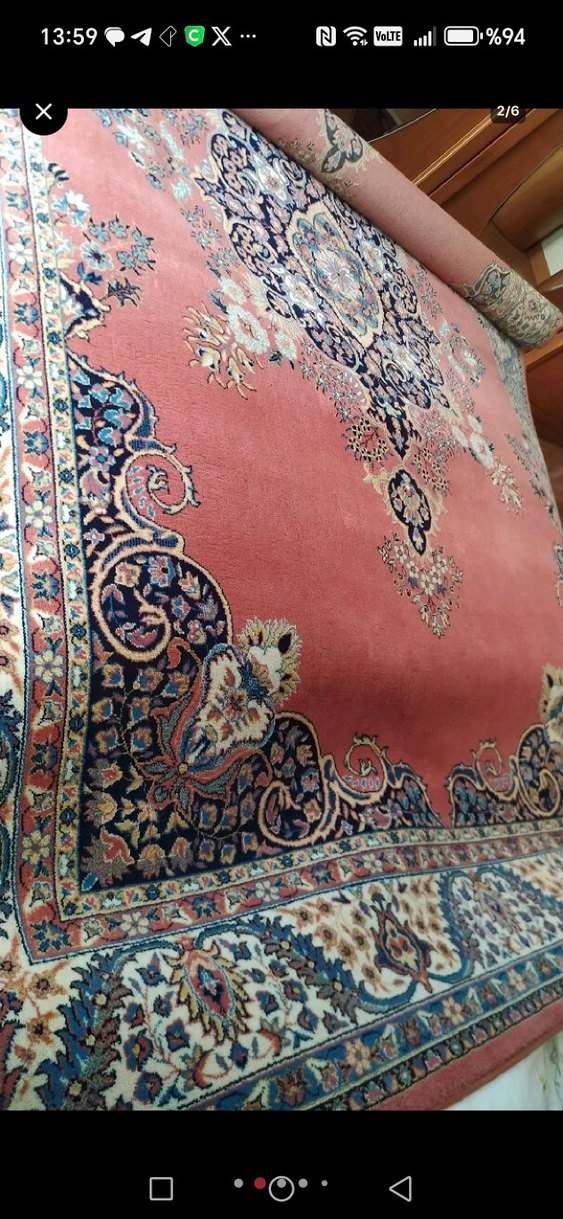 Koyu pembe renkte, çiçek desenli klasik tarzda detaylı desenlere sahip halı. Geleneksel stil ve zengin renkler bir arada.