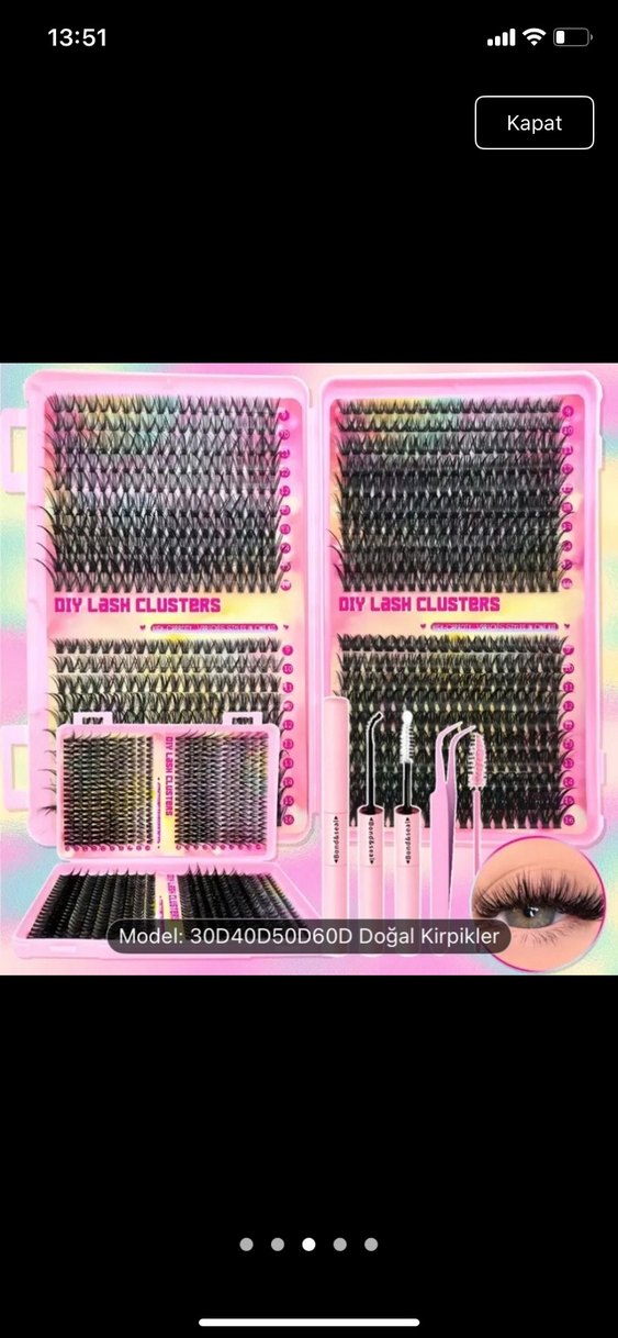 Koyu renkli, doğal görünümlü takma kirpikler farklı boylarda ve pembe ambalajda. Kolay uygulama için araçlar da dahil.