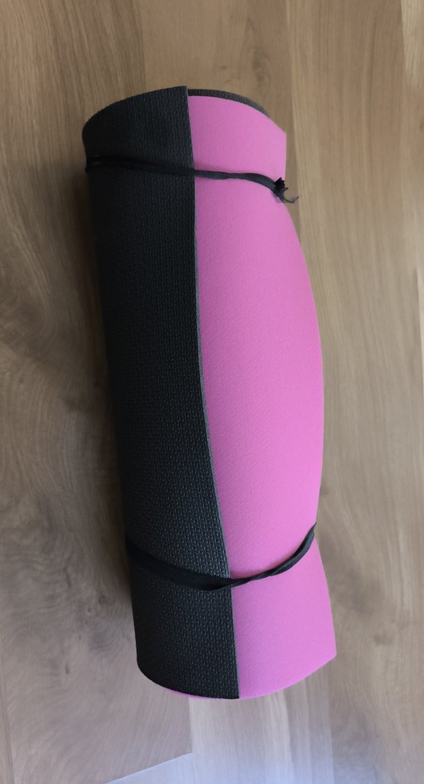 Koyu pembe renkte, desensiz egzersiz matı, taşıma kayışı ile birlikte rahat destek sağlar.