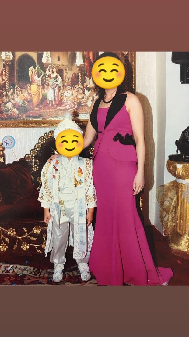 Koyu pembe renkli, etnik desenli, straplez ve kolsuz tasarıma sahip, dökümlü kesim ve sentetik kumaştan yapılmış abiye.