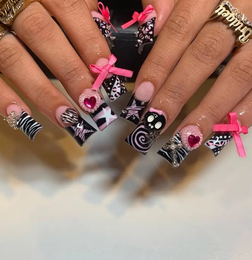 Koyu pembe fiyonklar, kalpler ve kafatası desenleriyle dikkat çeken tırnak süslemeleri. baska modeller icin sayfami ziyaret edebilirsiniz.