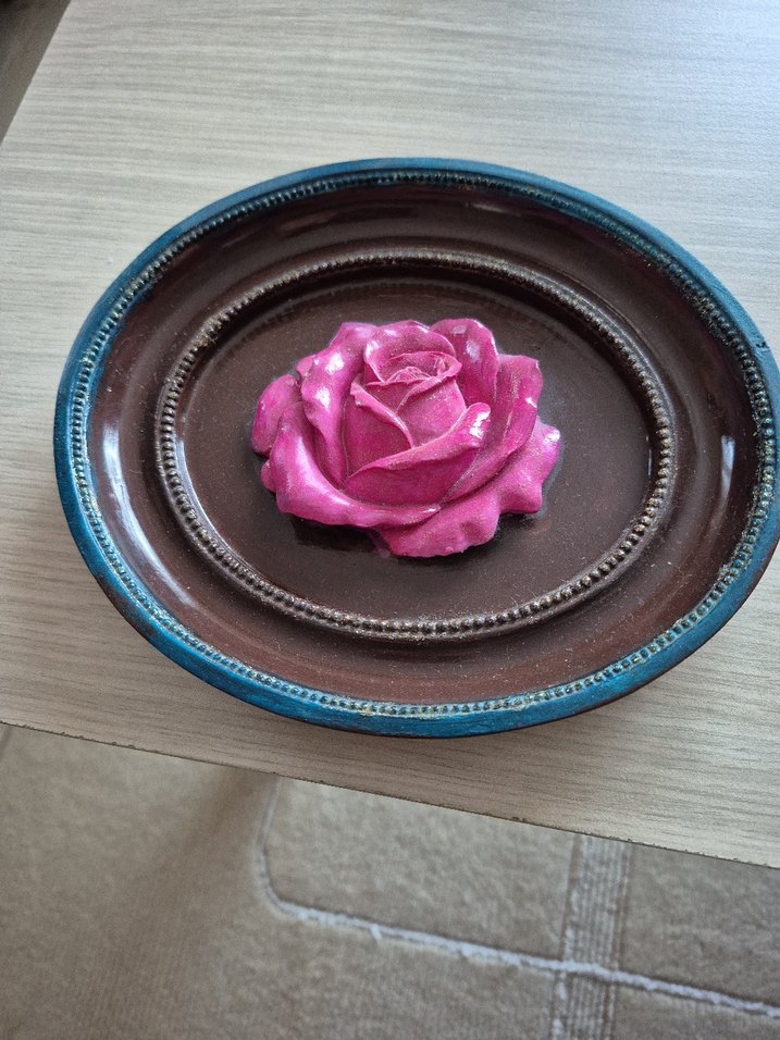 Mavi kenarlı kahverengi yuvarlak altlık üzerinde koyu pembe gül şeklinde