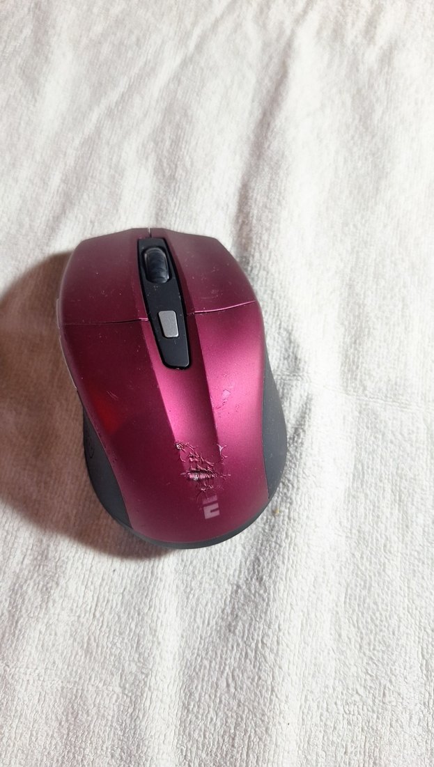 Koyu pembe kablosuz mouse, kaydırma tekerleği ve iki düğme ile. Yüzeyinde hafif aşınma izleri bulunur. ️