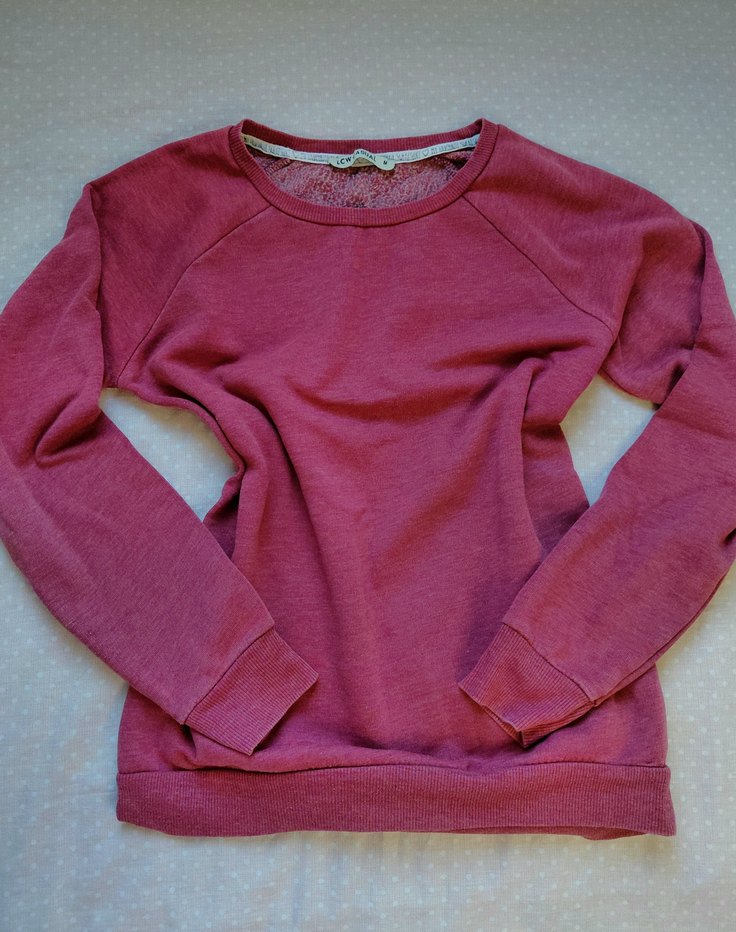 Koyu pembe pamuklu sweatshirt, yuvarlak yaka ve uzun kolludur. Günlük kullanıma uygundur.