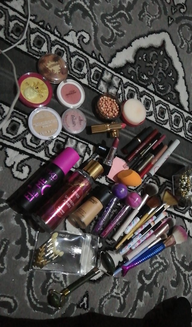 Koyu pembe tonlarında pudralar, rujlar, fırçalar ve çeşitli makyaj ürünlerinden oluşan set. Fiyat bilgisi için yazınız