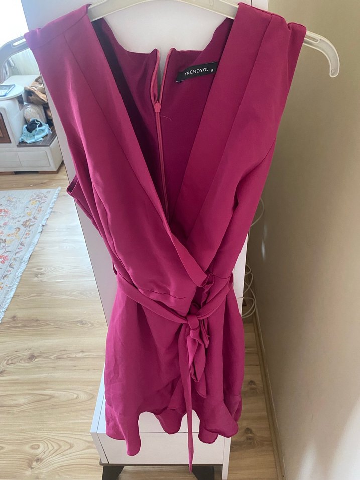 Koyu pembe renkli, kolsuz ve beli kuşaklı, vücuda oturan midi elbise. Paris sokak modasına uygun şık tasarım.