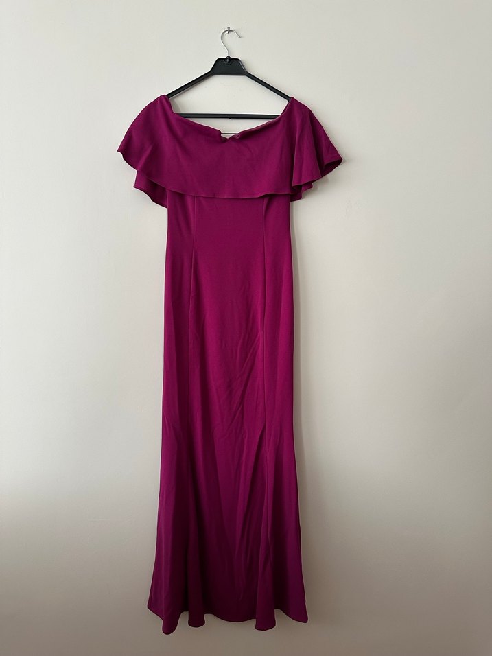 Koyu pembe omuzdan dökümlü kayık yakalı uzun abiye elbise. Fitted kesimi ve minimalist tarzıyla romantik akşamlara uygun.