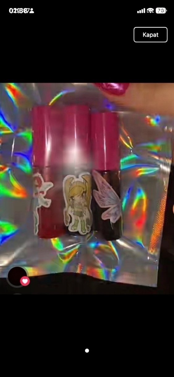 Üzerinde dekoratif çıkartmalar bulunan tüplerde üç adet koyu pembe lip tint seti, canlı parlaklık sağlar.