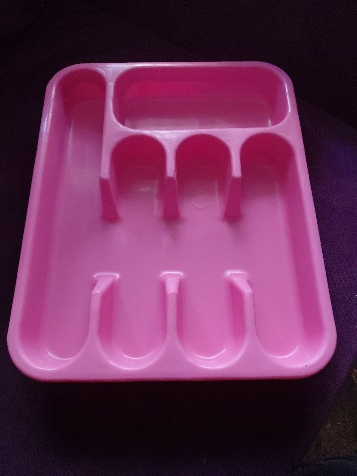 Koyu pembe renkte, çatallar, kaşıklar ve bıçaklar için bölmeleri olan plastik çatal kaşık düzenleyicisi.