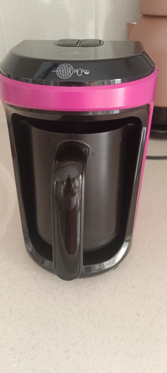 Koyu pembe renkte, siyah sap ve tabanlı kahve makinesi, canlı renk ve pratik tasarım sunar. ☕