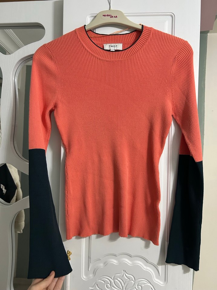 Bu dar kesim kadın kazağı, siyah kollar ve yuvarlak yaka ile uzun kolludur. Triko kumaştan yapılmış, normal boyda ve koyu pembe renktedir, günlük kullanıma uygundur.