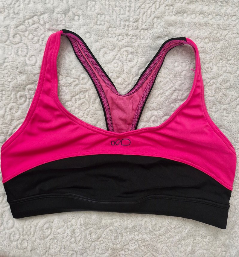 Koyu pembe renkli, siyah bantlı spor sütyeni. Athleisure ve sokak stili için uygun, 40 42 beden uyumludur. desensiz ve normal uzunlukta rahat destek sağlar.