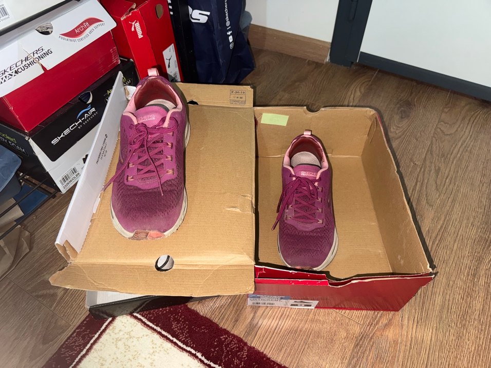 Koyu pembe renkli, archfit skechair teknolojili ayakkabı. Kullanıma bağlı deformasyon mevcut , iki taraf topuk sırtında hafif yırtılma olduğu için deri kaplama yaptırdım ömrü uzun olur, fotoğraflarda yıpranmalar mevcut