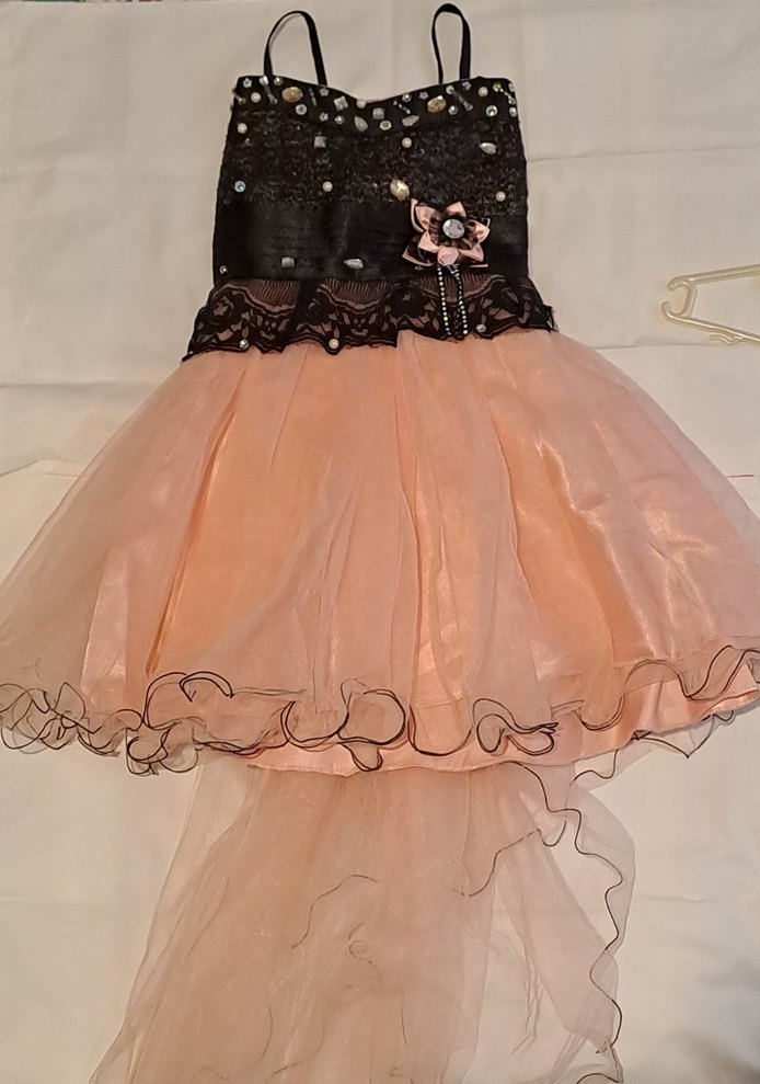 Koyu pembe fırfırlı etek ve siyah üst kısmı olan straplez, kolsuz, dar kesim kız elbisesi. Sentetik kumaştan yapılmış gotik tarzda avant-garde tasarım.
