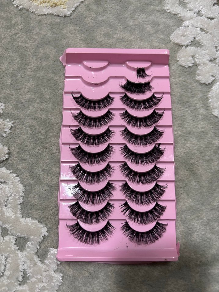 Koyu pembe renkte, doğal ve hacimli görünüme sahip çoklu takma kirpik seti, pembe tepside düzenlenmiştir.