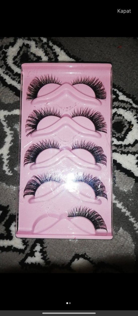 Farklı uzunluk ve yoğunlukta beş çift koyu pembe takma kirpik seti, göz görünümünü artırır.