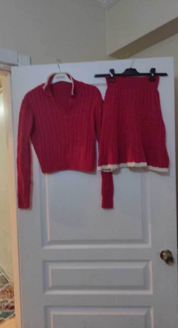 Koyu pembe renkli, yüksek yakalı ve uzun kollu, kısa kesim örgü triko takım. Sokak stiline uygun, sade ve rahat tasarım.