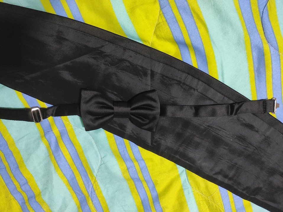 Koyu renkte, pürüzsüz dokulu erkek papyon ve kuşak modaya uygun ve avangart tarz için tasarlanmıştır. Sadece 1 kere giyildi.