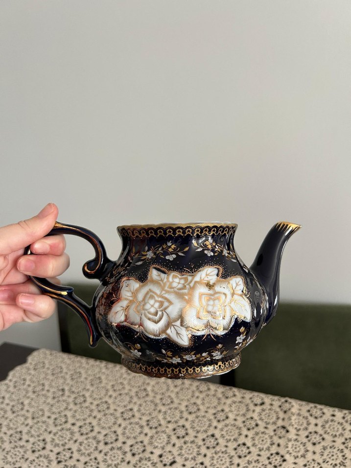 Koyu renkli beyaz çiçek desenli porselen demlik - Görsel 1