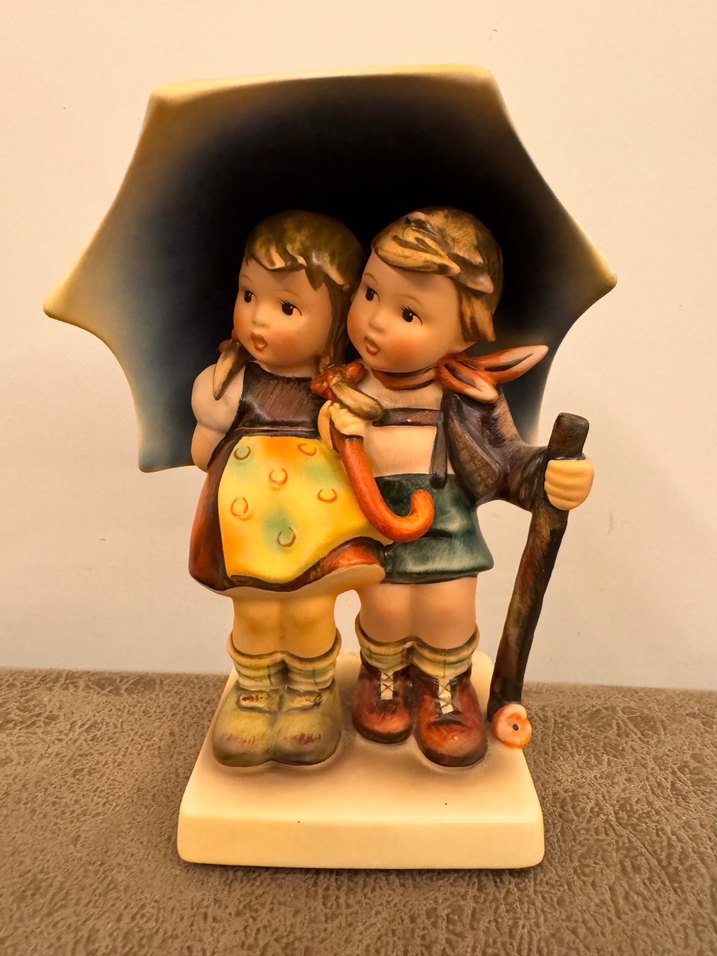 Koyu renk tonlarında, şemsiye altında duran iki çocuk figürlü biblo. Çocuklar camel ve pastel tonlarda kıyafetler giymiştir. Detaylı yüz ifadeleri ve aksesuarları bulunur. ☂️kusursuz Goebel ölçü verildi