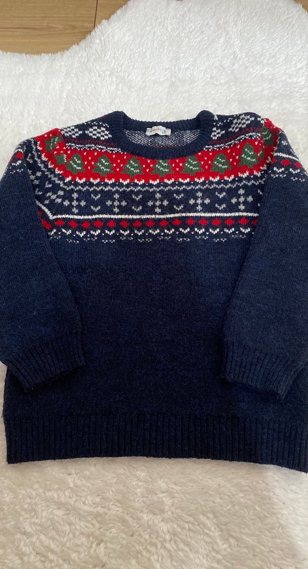 Koyu renkli, çok renkli desenli, örgü kadın kazak. Yuvarlak yaka, uzun kollu ve bol kesimdir. Rahat ve gündelik kullanıma uygundur. Hem erkek hem kız unisex parça