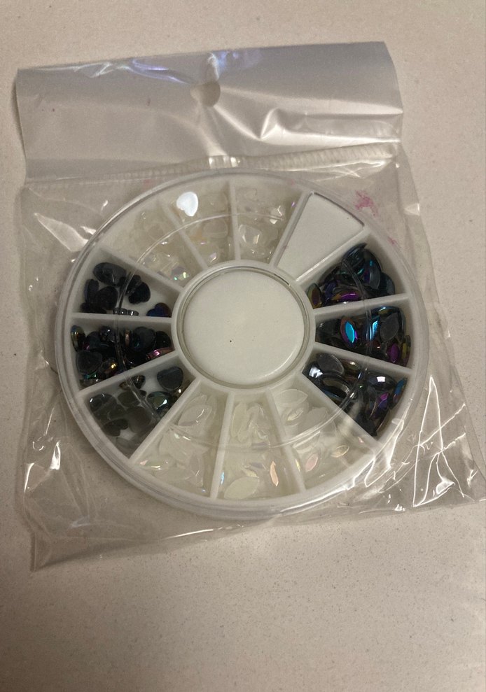 Koyu renkli ve çok renkli tırnak süslemeleri, yuvarlak kutuda düzenlenmiş, yaratıcı tırnak tasarımları için uygun.